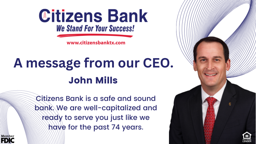 With the banking industry receiving so much attention as a result of the recent bank failures across our nation, I would like to share with our customers and communities that Citizens Bank is a safe and sound bank. We are well-capitalized and ready to serve you just like we have for the past 74 years.